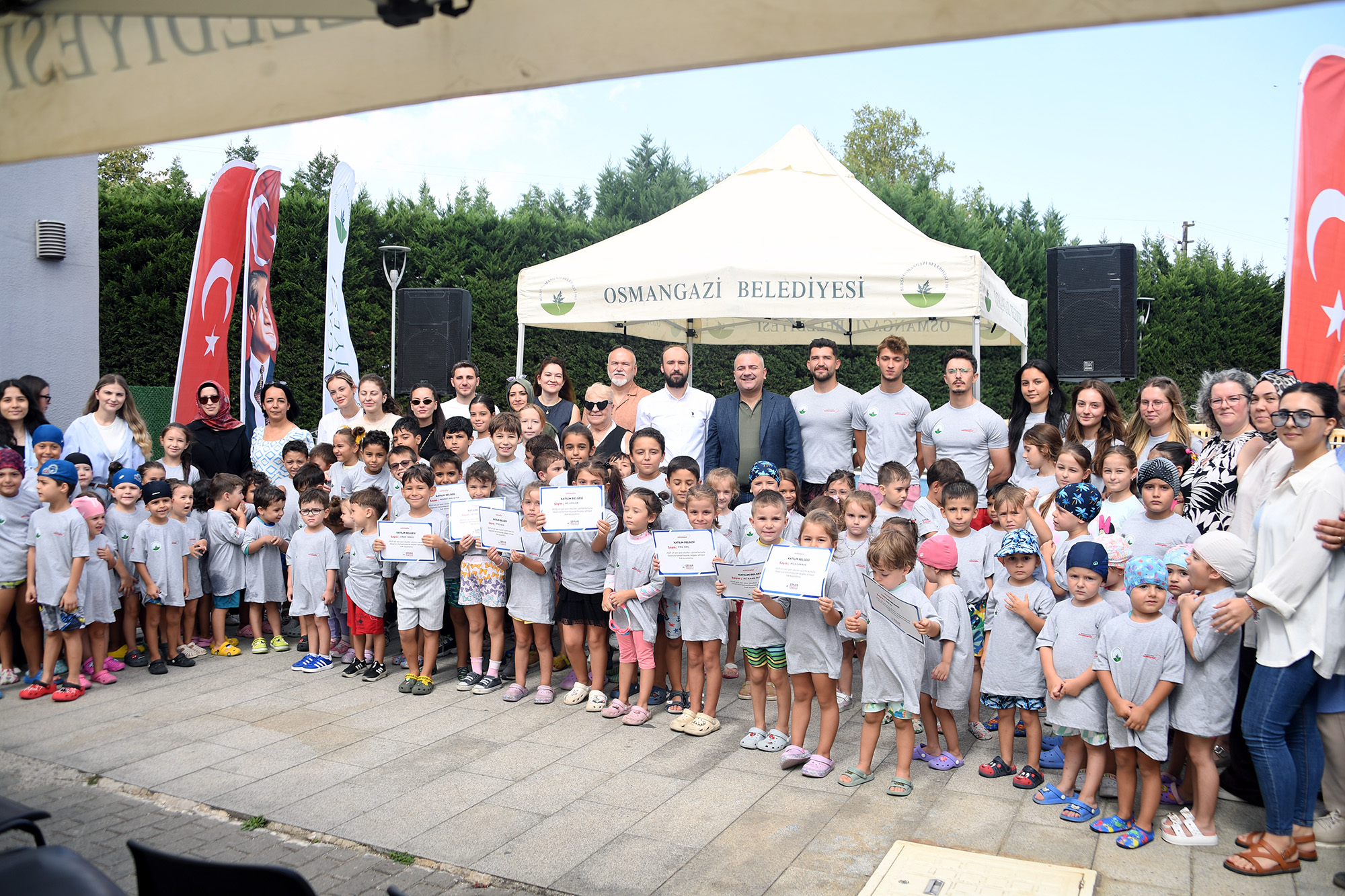 Çocukların yaz tatilini hem verimli hem de eğlenceli geçirmeleri için hazırlanan kursların sonunda Ertuğrul Sağlam Spor Tesisi’nde sertifika töreni düzenlendi. Eğitimlerini başarıyla tamamlayan küçük yüzücüler, sertifikalarını Osmangazi Belediyesi Gençlik ve Spor Hizmetleri Müdürü Ersel Nallar’ın elinden aldı.