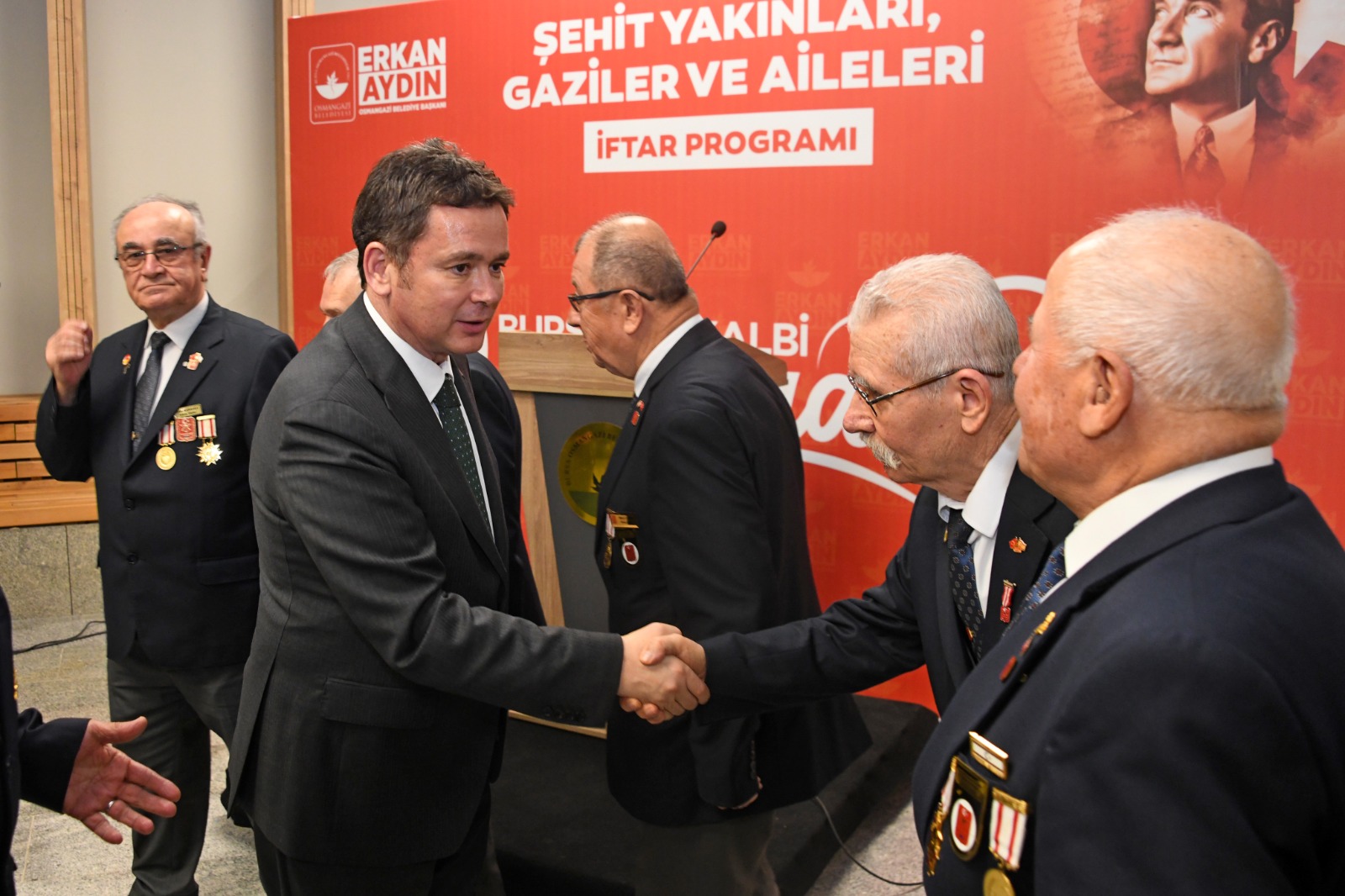 Osmangazi Gösteri Merkezi’nde, Ramazan ayının manevi ikliminde kurulan iftar sofrasına; Osmangazi Belediye Başkanı Erkan Aydın’ın yanı sıra CHP Osmangazi İlçe Başkanı Raşit Gürbüz, Türkiye Muharip Gaziler Derneği Bursa Şube Başkanı Adem Erdem, Türkiye Harp Malulü Gaziler Şehit Dul ve Yetimleri Derneği Bursa Şube Başkanı Haşim Sivri, Bursa Emniyet Teşkilatı Şehit ve Gazi Aileleri Yardımlaşma Derneği Başkanı Nevin Fırtına, belediye başkan yardımcıları, meclis üyeleri, çok sayıda şehit yakını ile gazi katılım gösterdi.