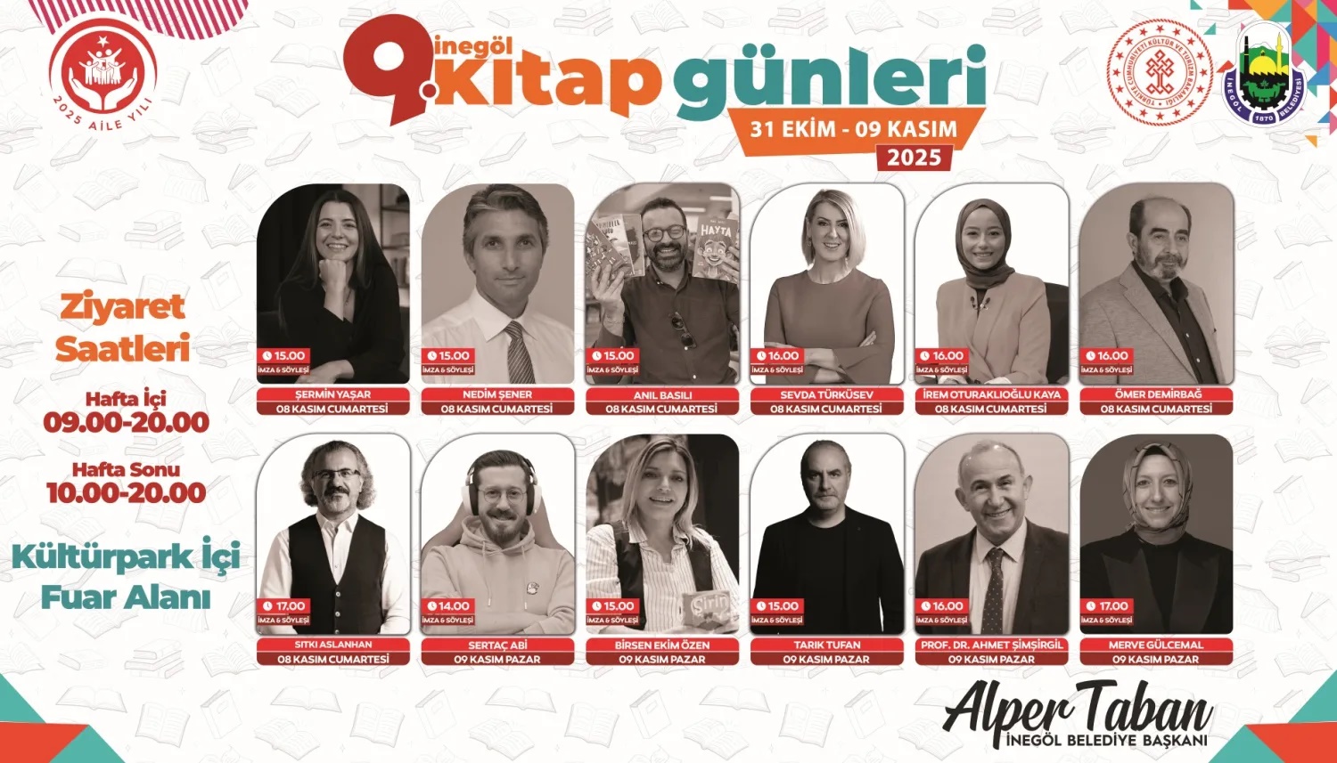 İnegöl Belediyesi’nin düzenlediği 9. İnegöl Kitap Günleri 31 Ekim Cuma günü kapılarını açtı. 10 gün süren organizasyonda 173 yazar, 105 yayınevi ve 1 milyonu aşkın kitap kitapseverlerle buluşurken, özellikle hafta sonları yapılan yazar buluşmaları, imza günleri ve söyleşiler büyük ilgiyle karşılaştı. Hafta içi de her gün farklı yazarları ağırlayan organizasyon, 8-9 Kasım Cumartesi ve Pazar günleri gelecek yazarlar ve yapılacak yazar buluşmalarıyla adından söz ettirecek. İnegöl Kitap Günlerinde son 2 günde adeta yazar geçidi yaşanacak.